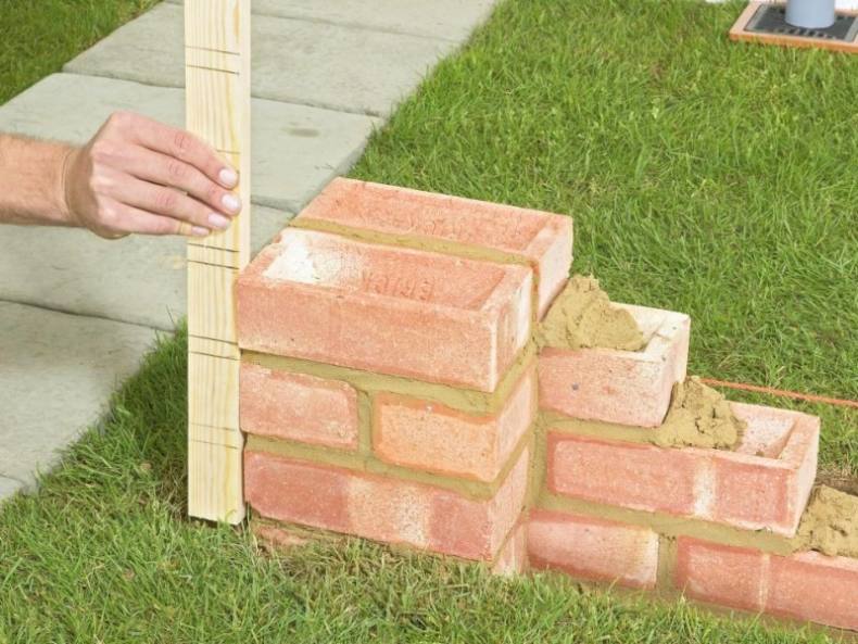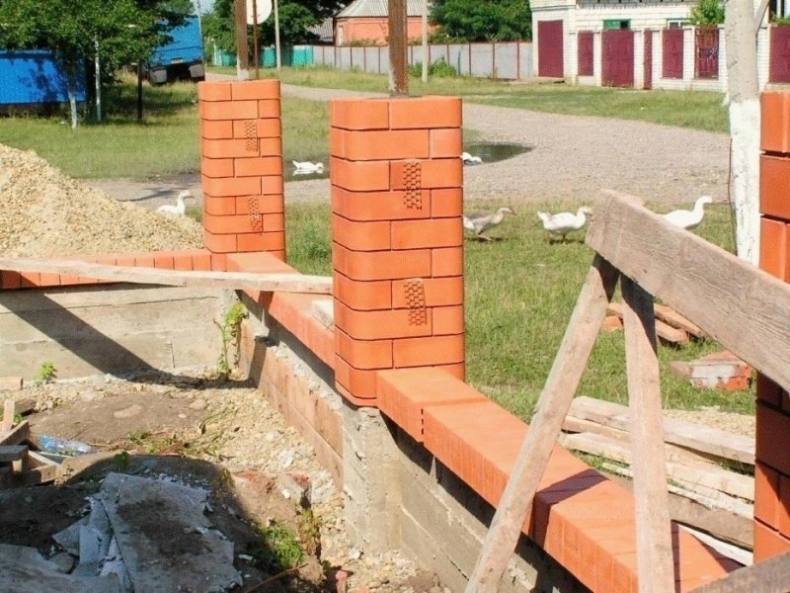 Обычно кладку делают в два и полтора кирпича. Проверить вертикальное и горизонтальное положения каждого ряда, не забыть про элементы, которые в дальнейшем будут соединять столбы с секциями.