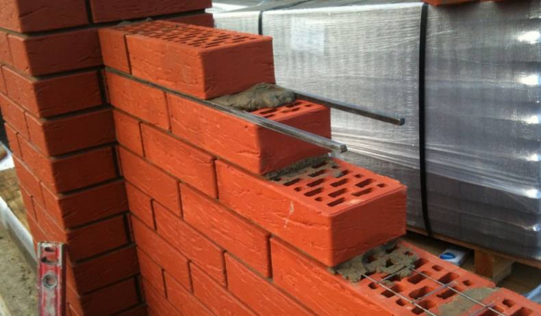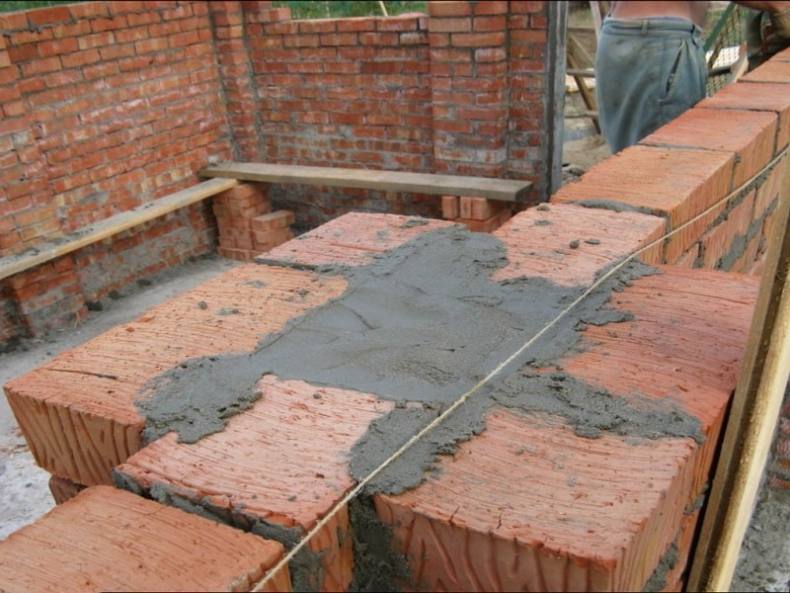 - Между кирпичами тонким слоем положен раствор цемента. Плоский шов должен быть не меньше восьми миллиметров. Для выравнивания его толщины опытные мастера предпочитают использовать кладку под пруток.