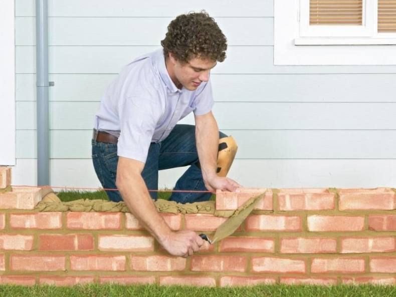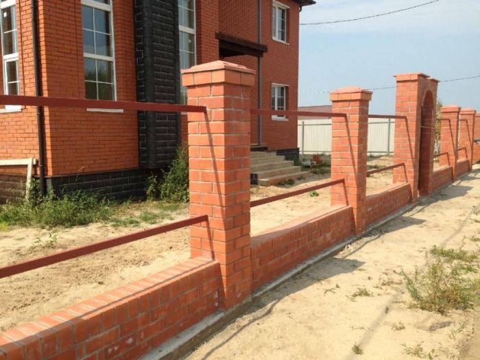 - Затем следует возведение секций забора вокруг жилища. Между кирпичами класть раствор слоем толщиной в восемь миллиметров.