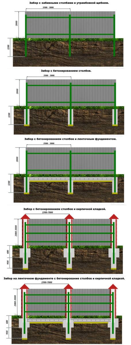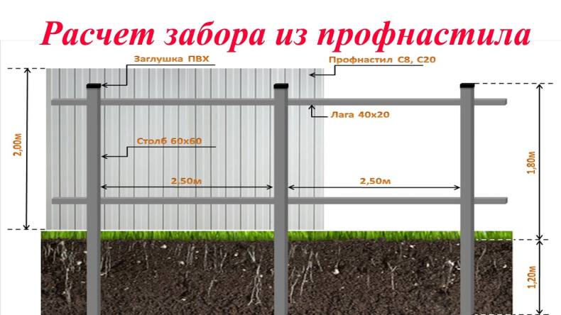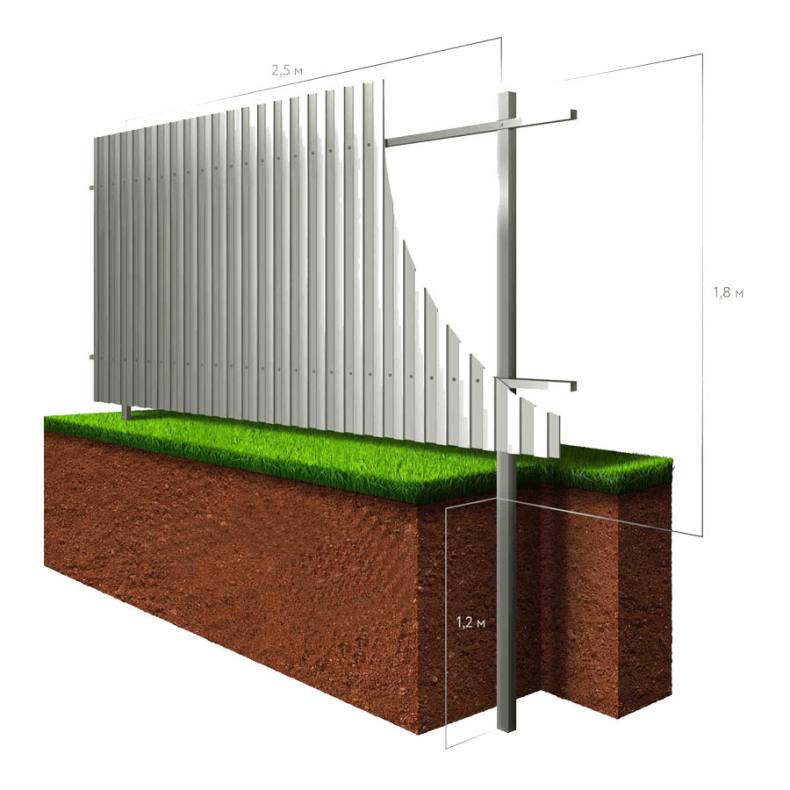 Опорные столбы ставят на расстоянии 2 — 3 метра друг от друга. Длину делят на 2 или 3 и получают необходимое количество труб. Стойку заглубляют на 30 см ниже точки промерзания грунта. Для средней полосы России это 1,2 — 1,5 м. Итого получается высота — 3,5 м.