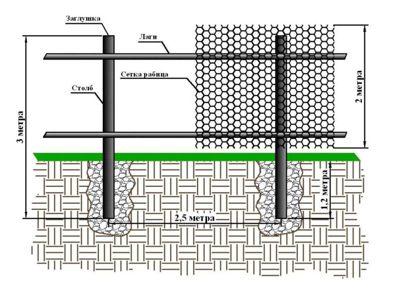 - Во избежание провисания сетки вам нужно располагать опорные столбы на одинаковом расстоянии друг от друга (рекомендуемый параметр — 2 метра).