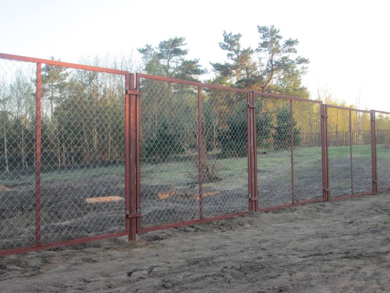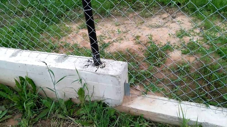 - Если забор секционный, то необходима правильная варка прочного и надежного каркаса. Затем производится размещение опорных столбов, которые должны находиться ровно по одной линии. Их нижние части заливаются раствором из бетона, песка и гравия. Сетку-рабицу приваривают к углам, расположенным горизонтально на всех рамах или элементах. Та же самая процедура проводится с изделиями со слегами.