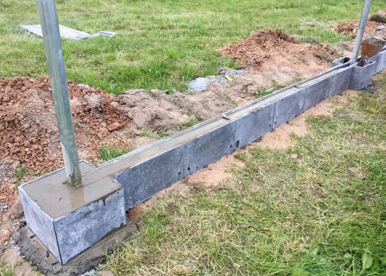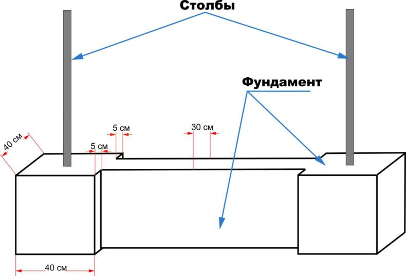 Под ленточный фундамент выкапывается траншея глубиной 80 см, шириной 20–40 см. Под отдельное бетонирование столбов нужно пробурить или выкопать лунку, радиус которой должен минимум на 30 мм больше, чем у столба. 3 см — это рабочий слой бетона с мелким гравием.