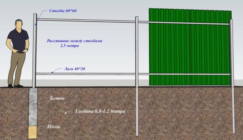 К крайним опорам нужно добавить 3–4 заготовки для последующего навешивания калитки и ворот. Промежуточные точки распределяются равномерно по прямой с шагом 2–2,5 метра. Для того чтобы не ошибиться в расчетах, проще составить схему на бумаге.