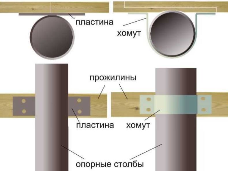Можно взять трубы, они также обладают высоким сопротивлением на изгибание. Но к ним сложнее приварить пластины для монтажа прожилин. Также практикуется установка традиционных бревен.