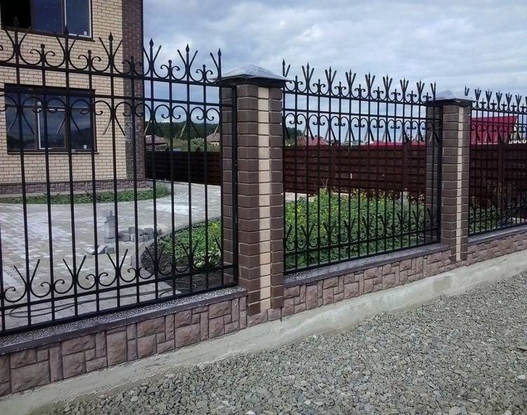 - Металл имеет свойство хорошо сочетаться с другими разновидностями материалов (например, с поликарбонатом, камнем и кирпичом), что обеспечивает создание привлекательных видов комбинированных заборов;