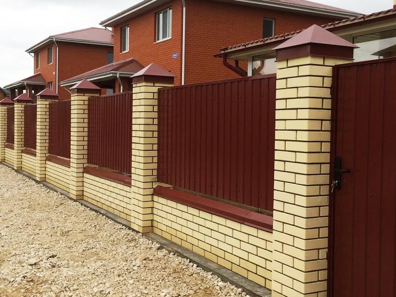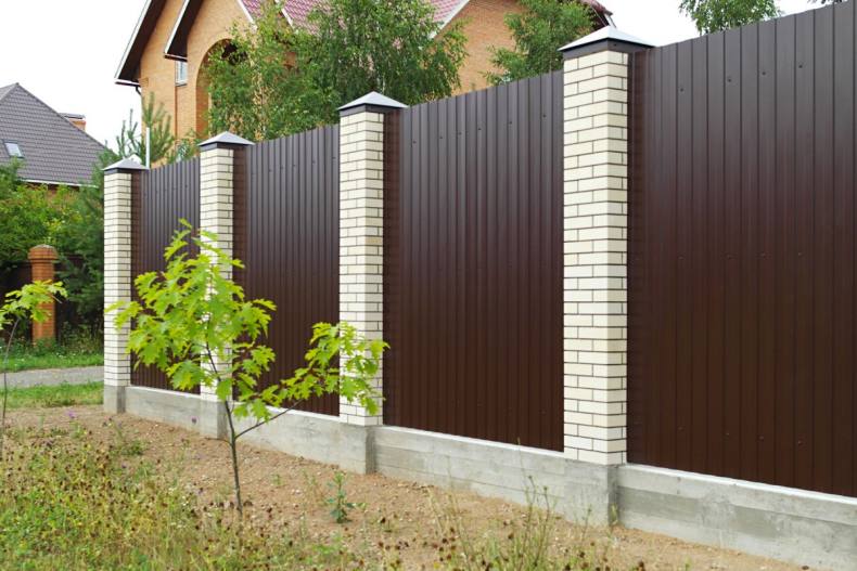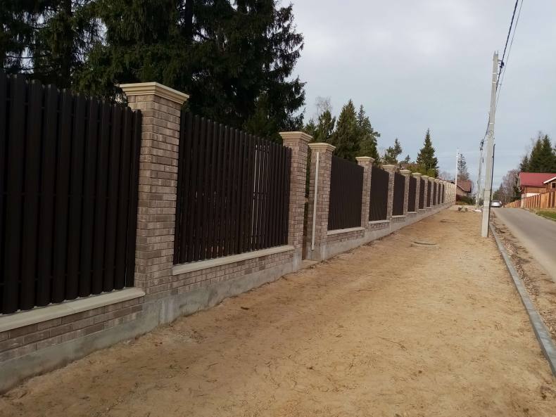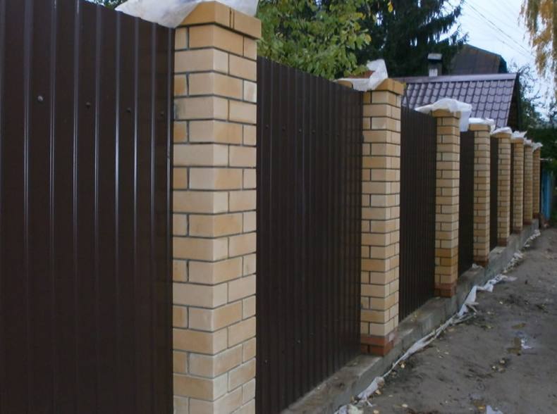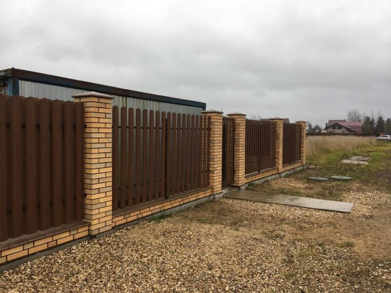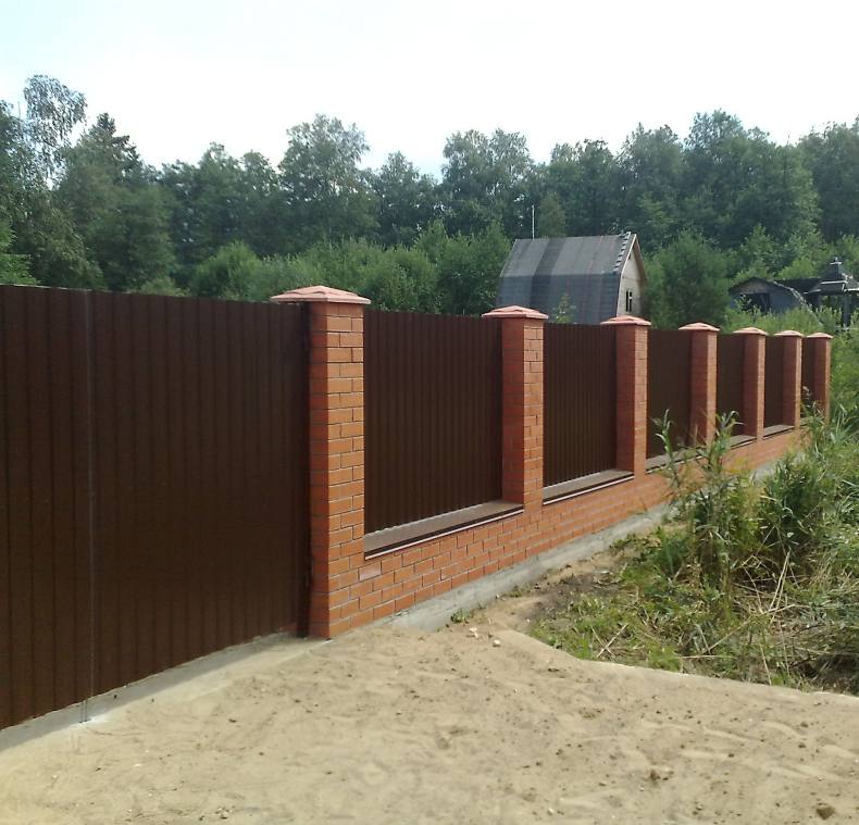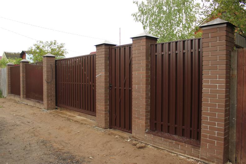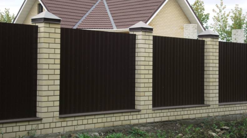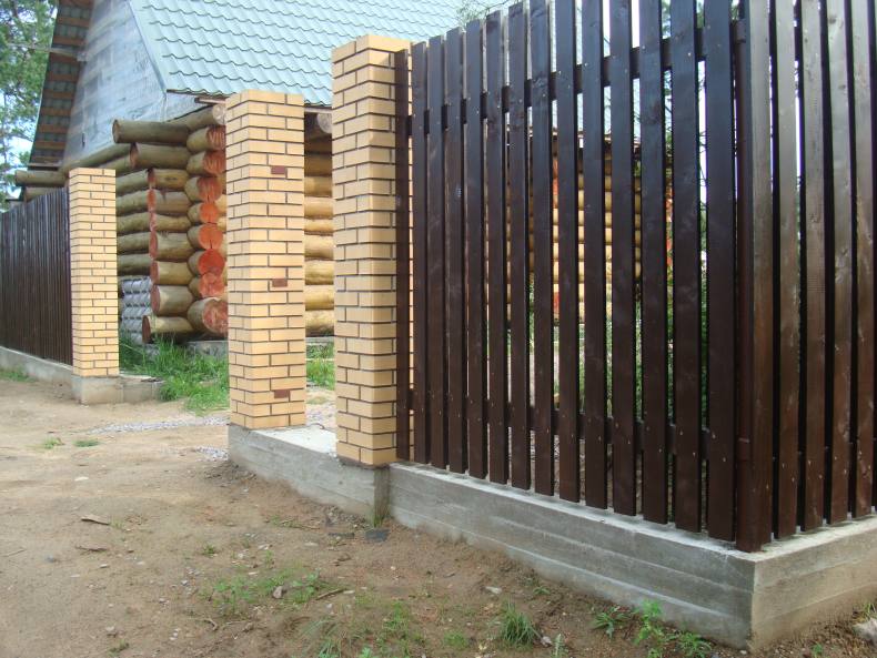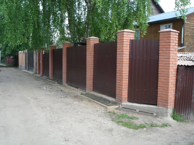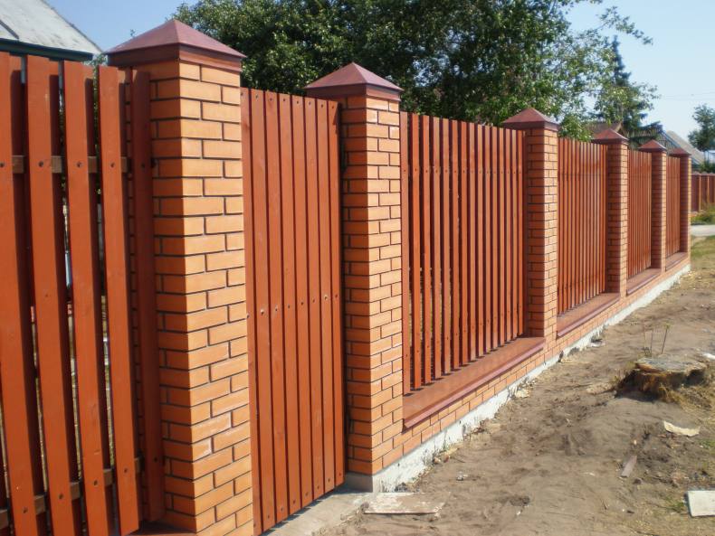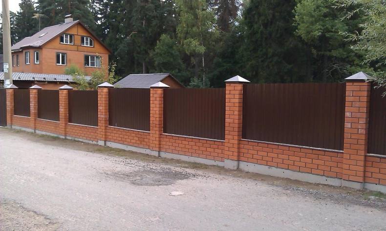 Одним из наиболее популярных вариантов в данном случае является забор с кирпичными столбцами.
