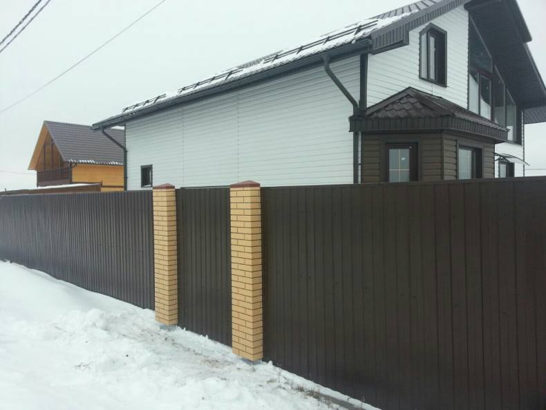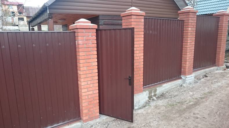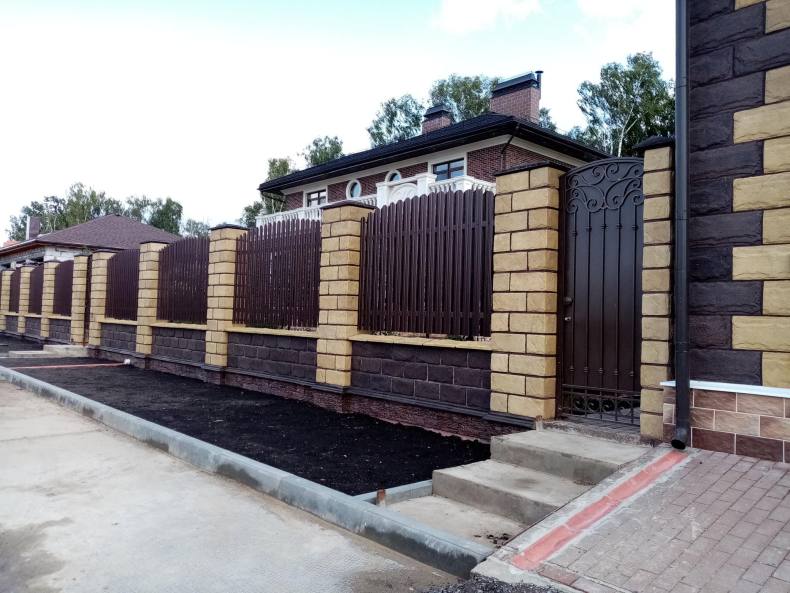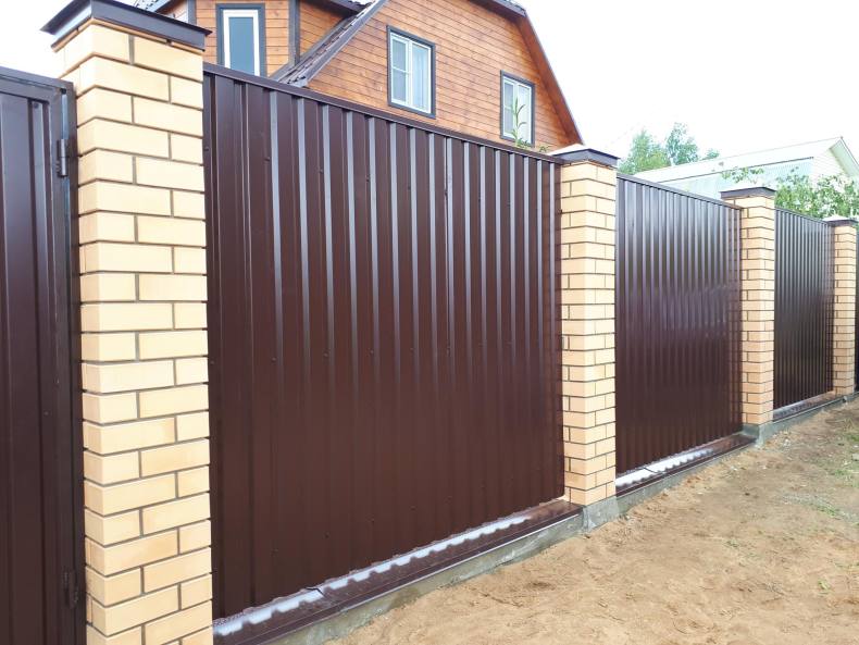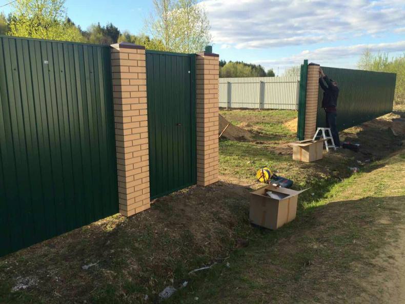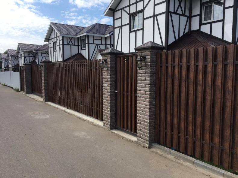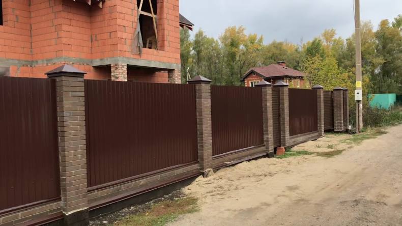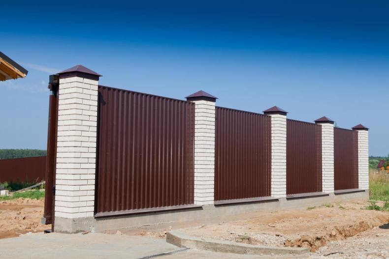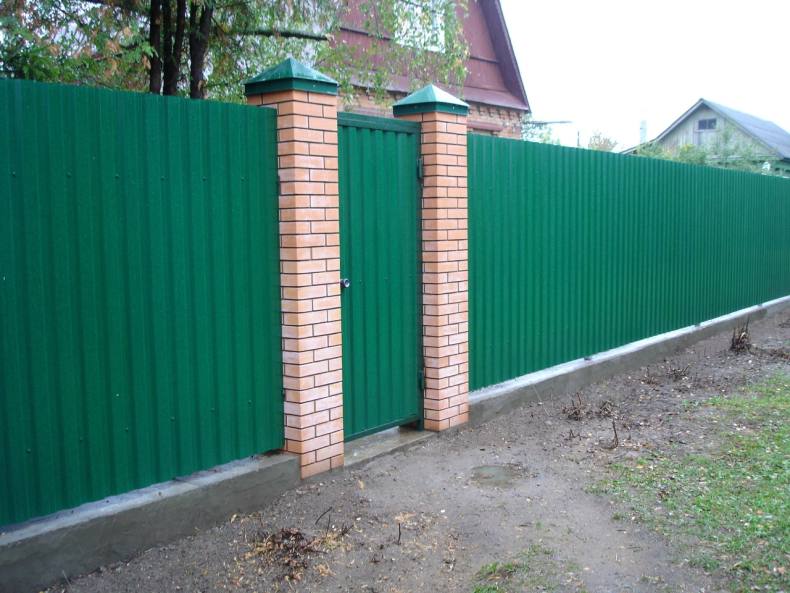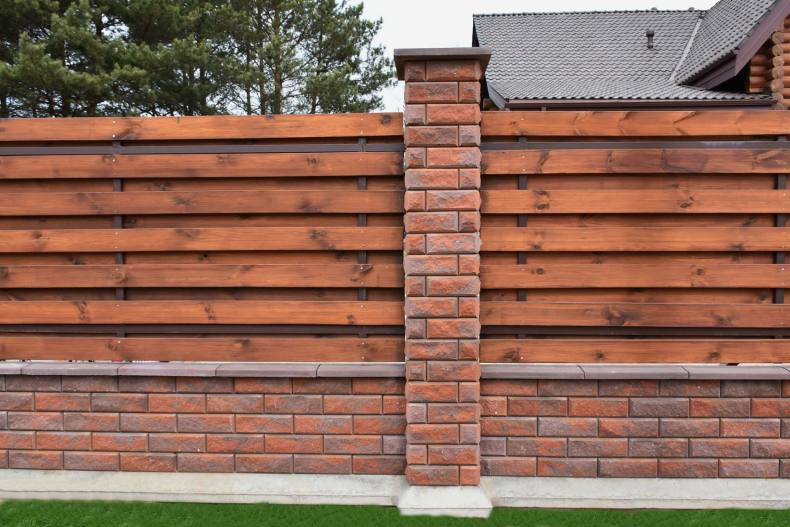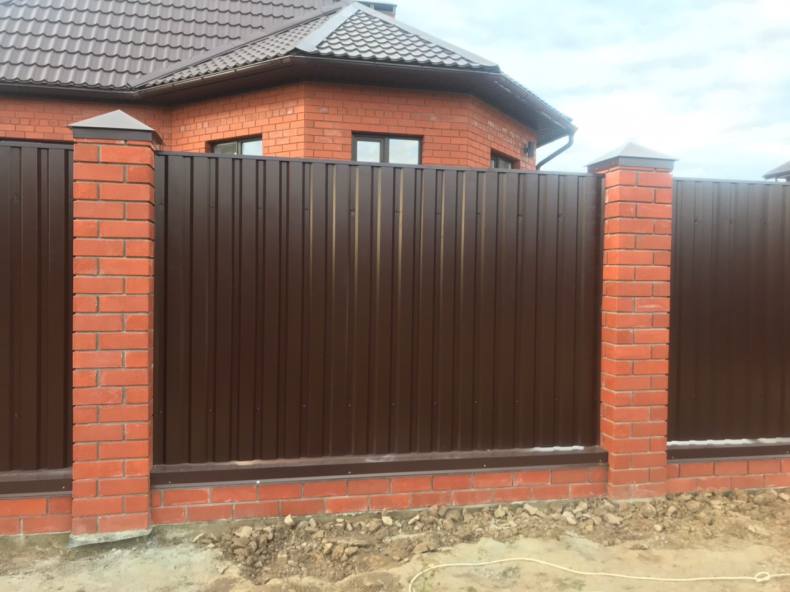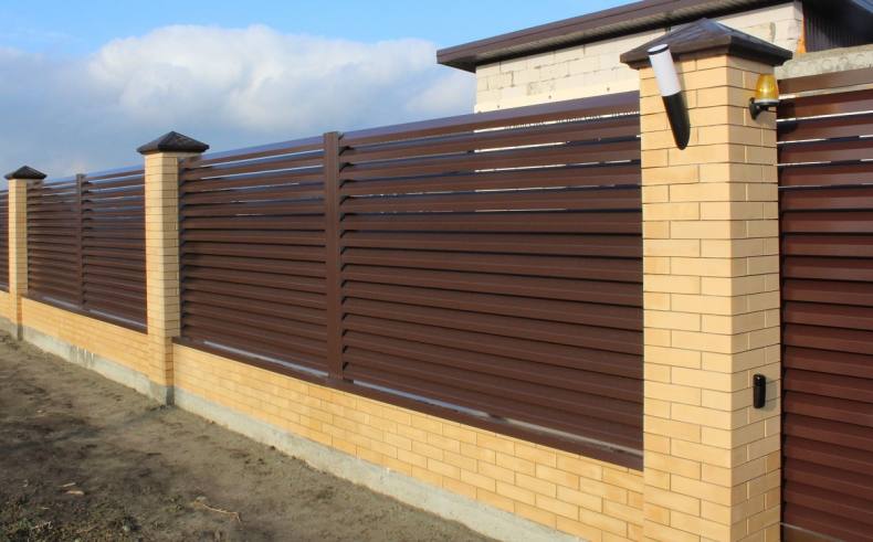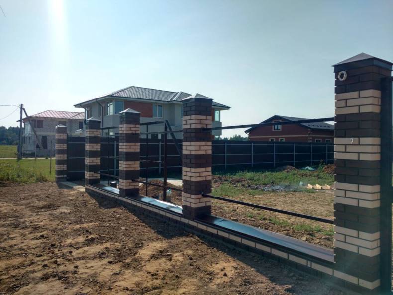 Одним из наиболее популярных вариантов в данном случае является забор с кирпичными столбцами.