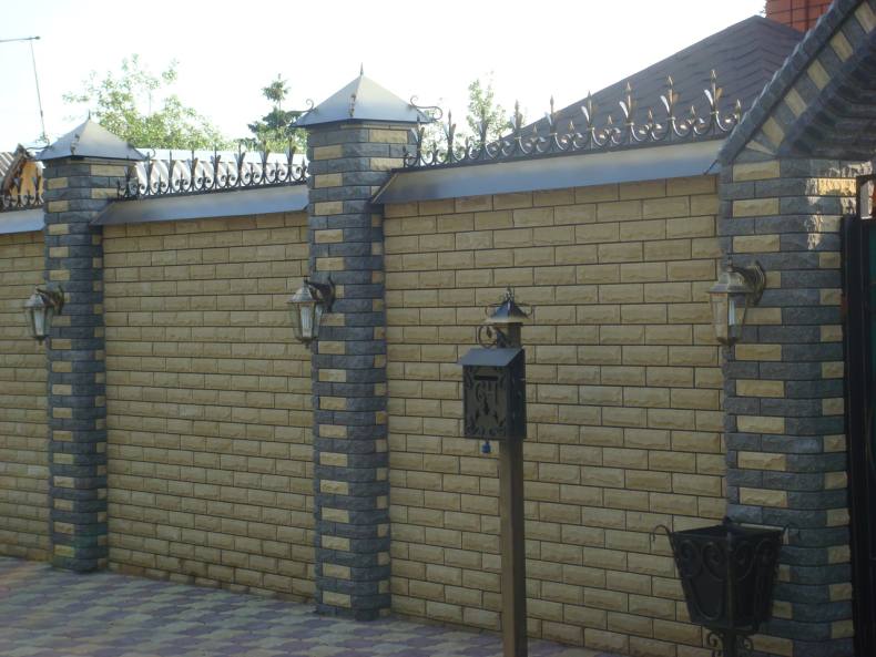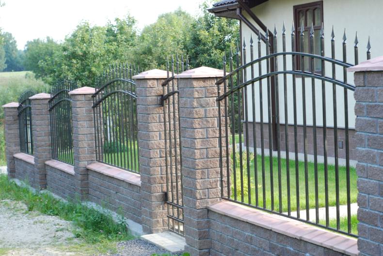 - Забор из кирпичных столбцов с кованными пролетами (классический вариант).
