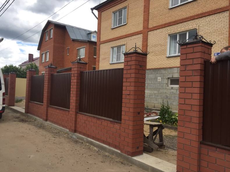 Особенности такого варианта состоят в том, что и кладка, и сам забор выполняются из кирпича.